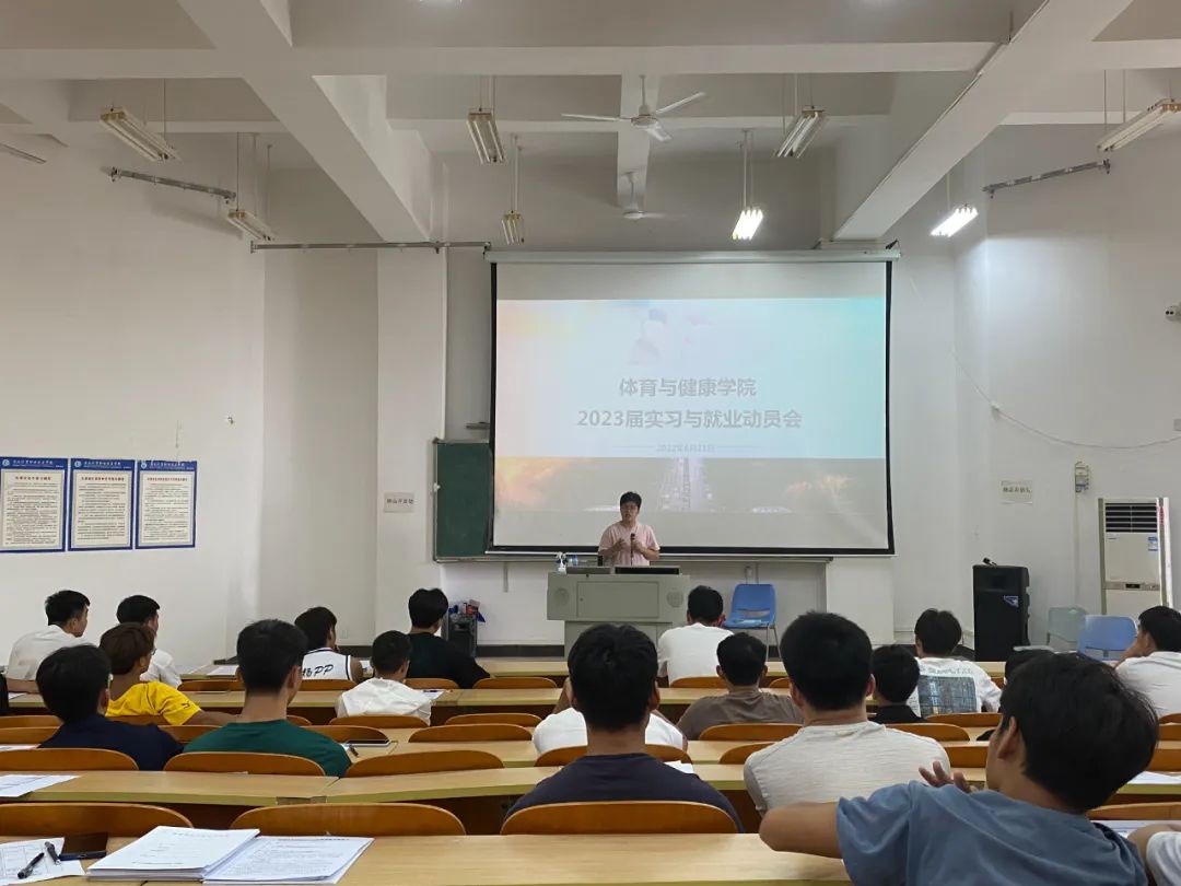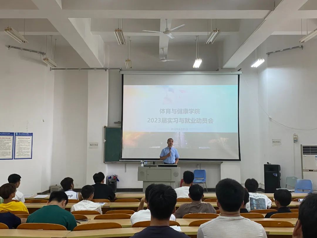 会上,黄闻寰副院长对就业择业相关事项为同学们做了讲解和指导,教务办郭柏成老师向同学们详细讲解了实习过程中将会遇到的情况,同时提醒同学们务必要关注自身学业成绩。专业教研室主任李新华老师希望同学们外出实习一定要是从事有益自身成长的实习工作,不要应付实习,并且提醒同学们一定要做好职业规划,做好升本准备。随后,陈圣老师要求同学们在完成实习工作的同时,提升就业能力,展现就业本领,为同学们讲解了如何使用就业系统。胡友波院长对2023届毕业生提出三点要求,一是要求同学们高度重视毕业实习,二是要求同学们做好自身技能提升,三是要求同学们认真高效地做好工作,同时希望同学们在完成实习之余不忘学习,保持学习,以体院人最好的精神面貌去面对生活、工作中遇到的困难。