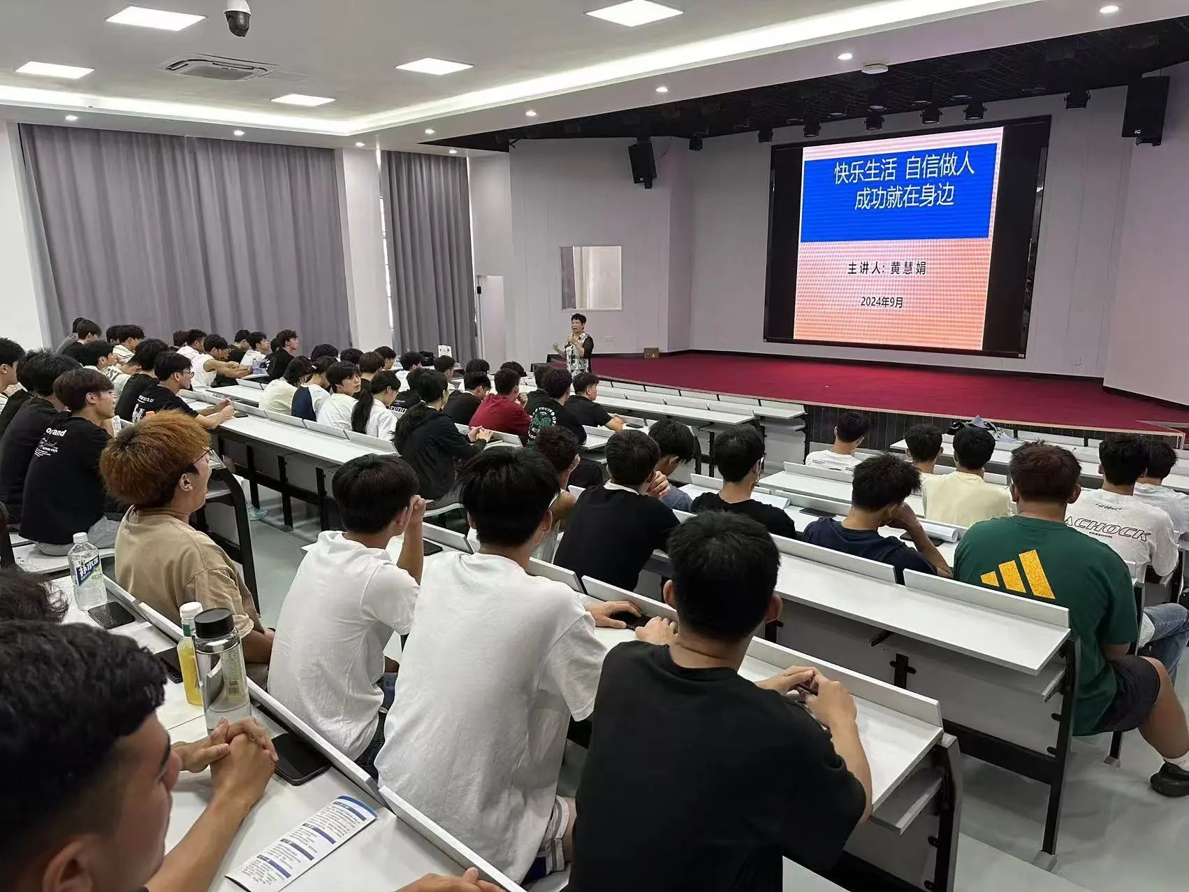 本次活动由离退休老师黄慧娟担任主讲。黄老师以《快乐生活,自信做人,成功就在身边》为题,向同学们生动讲述了当代在校大学生所需的八大心态,并深入浅出地诠释信念、信心、信任与成功的关系。黄老师指出大学生应提高文化素养,努力做到立大志、明大德、成大才、担大任。讲座结束后,黄老师与现场学生进行交流互动,对学生如何在日常学习、生活中更好地保持良好的心态等问题进行详细解答。