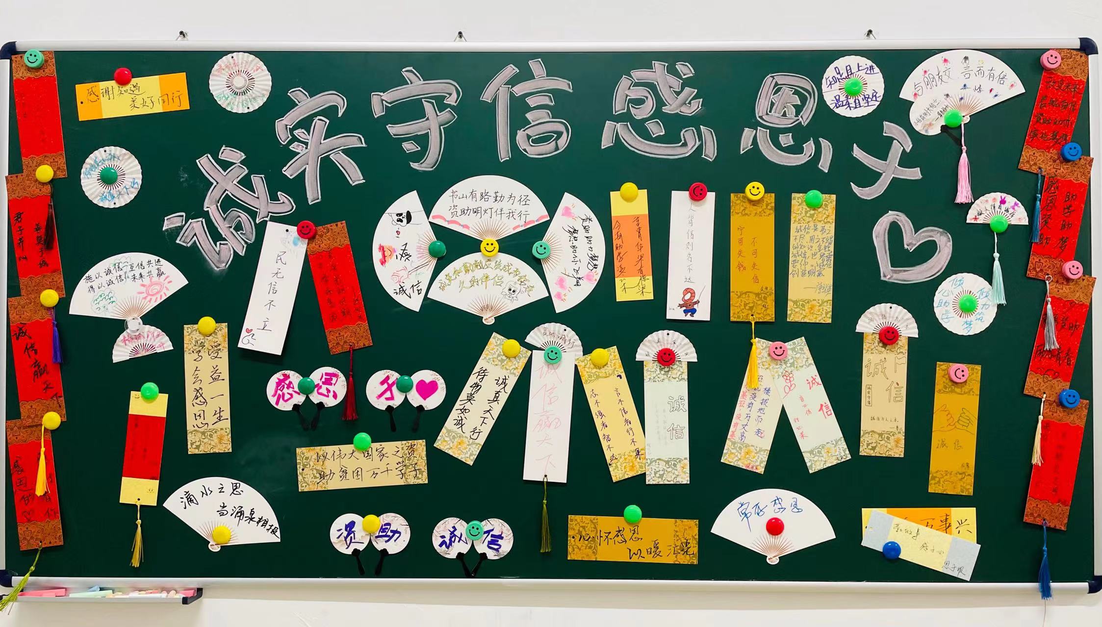利用课余时间,采用亲手制作的诚信书签并相互赠送的方式宣传诚信文明。各种形状多样的书签,加上生动的绘画,各种诚信和感恩的标语生动地呈现。