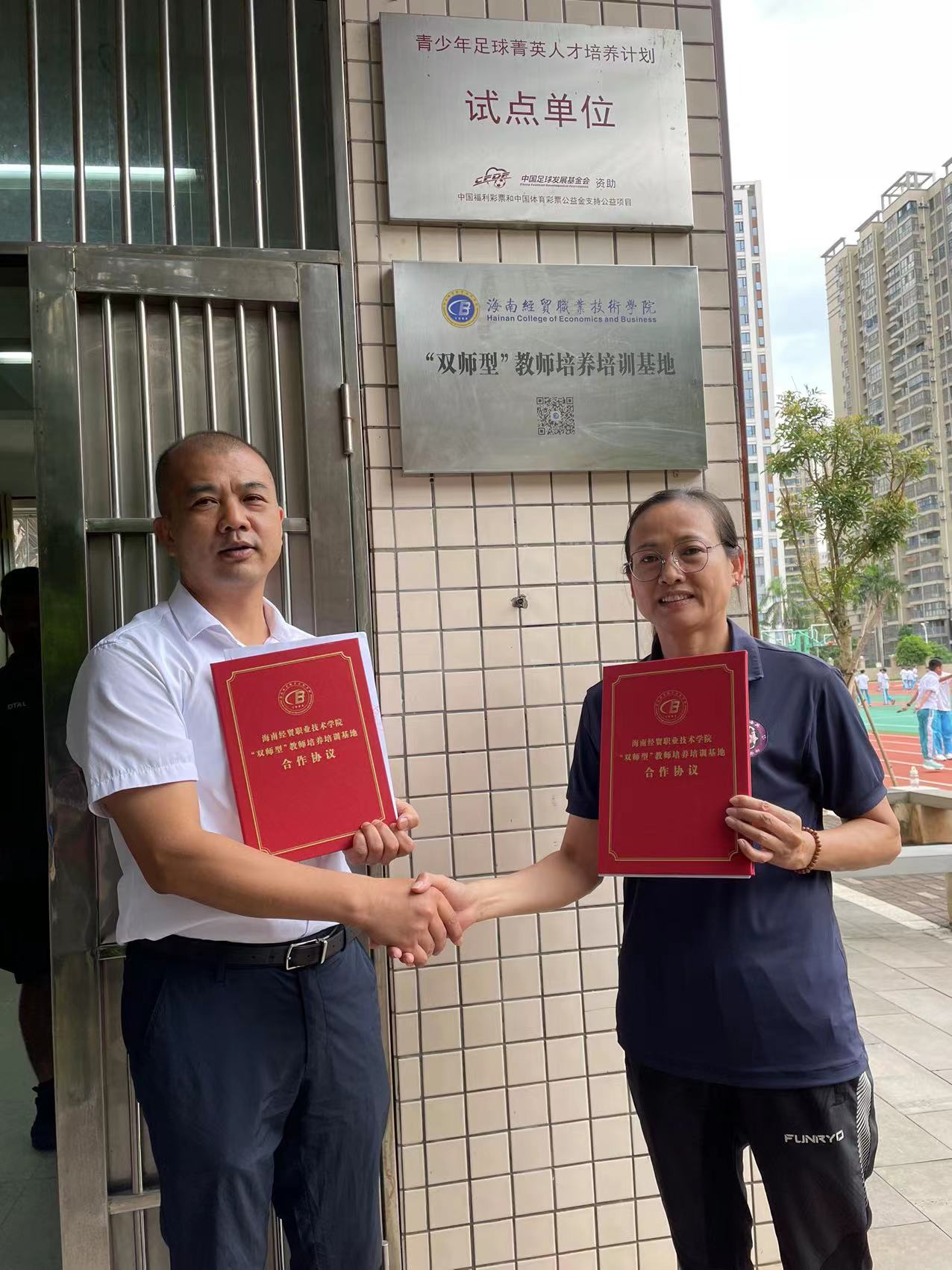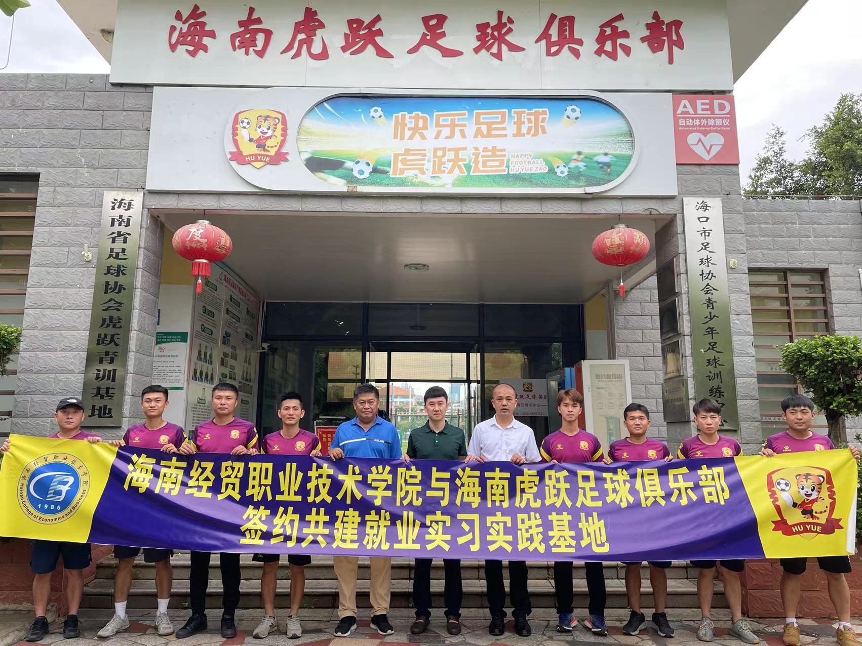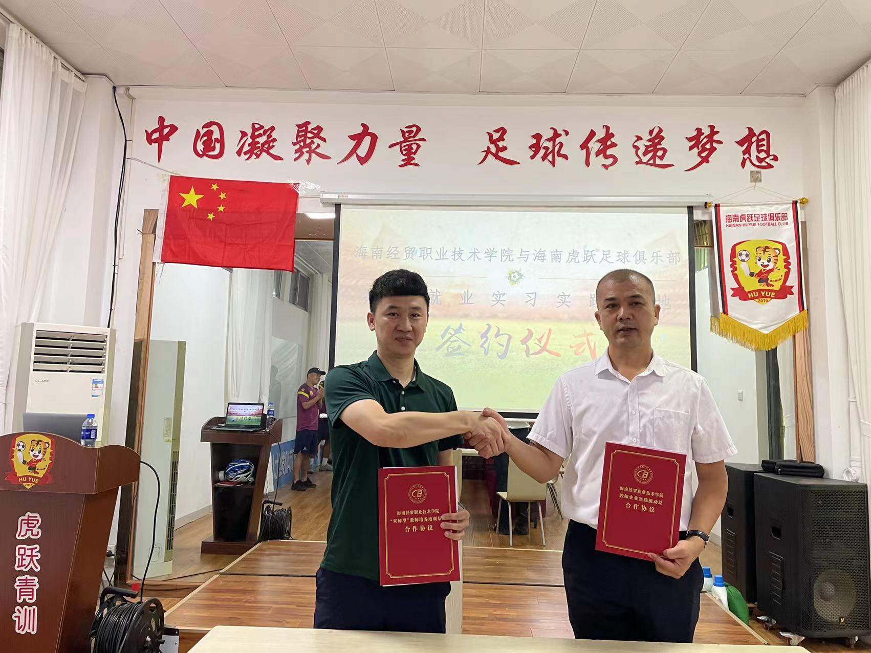 为贯彻落实《海南经贸职业技术学院教师企业实践基地建设三年行动计划(2021-2023)》和“访企拓岗”专项行动,进一步深化校企合作,落细落实教师企业实践基地建设和访企拓岗促就业工作,2022年6月8日,太阳成集团tyc分别与海南韦海英足球俱乐部、虎跃足球俱乐部签订合作协议并举行挂牌仪式,太阳成集团tyc院长胡友波、副院长黄闻寰出席。