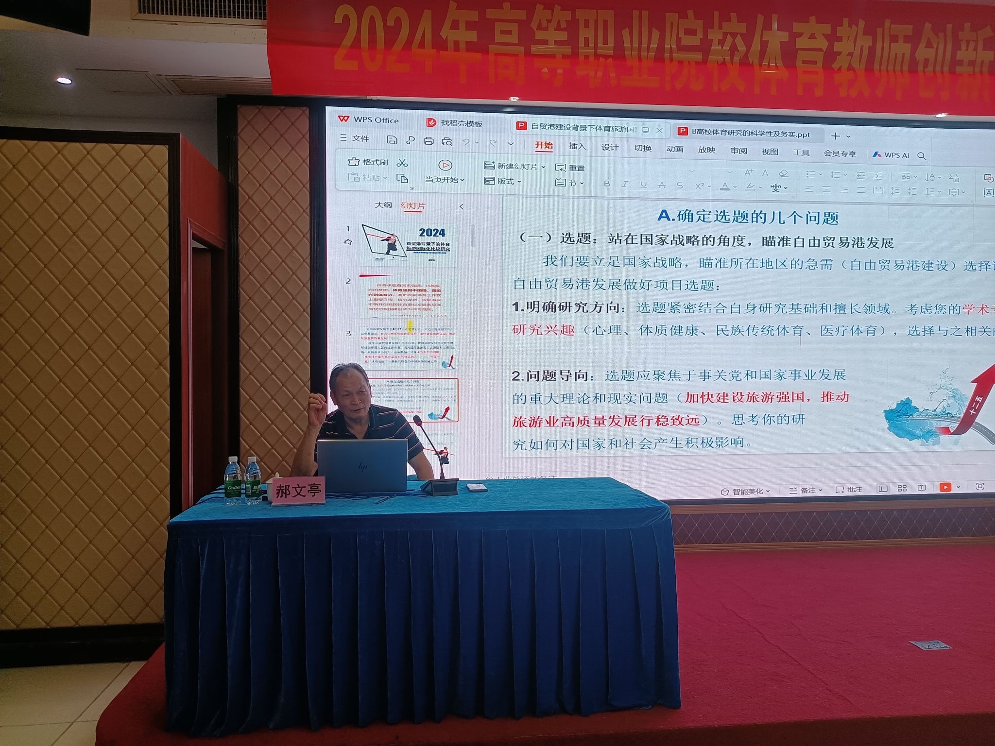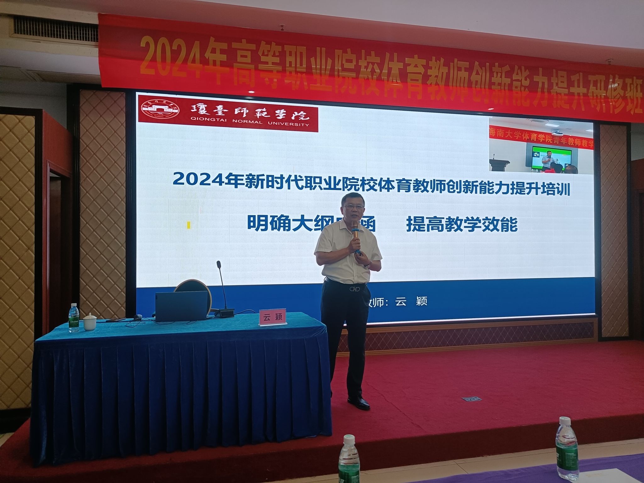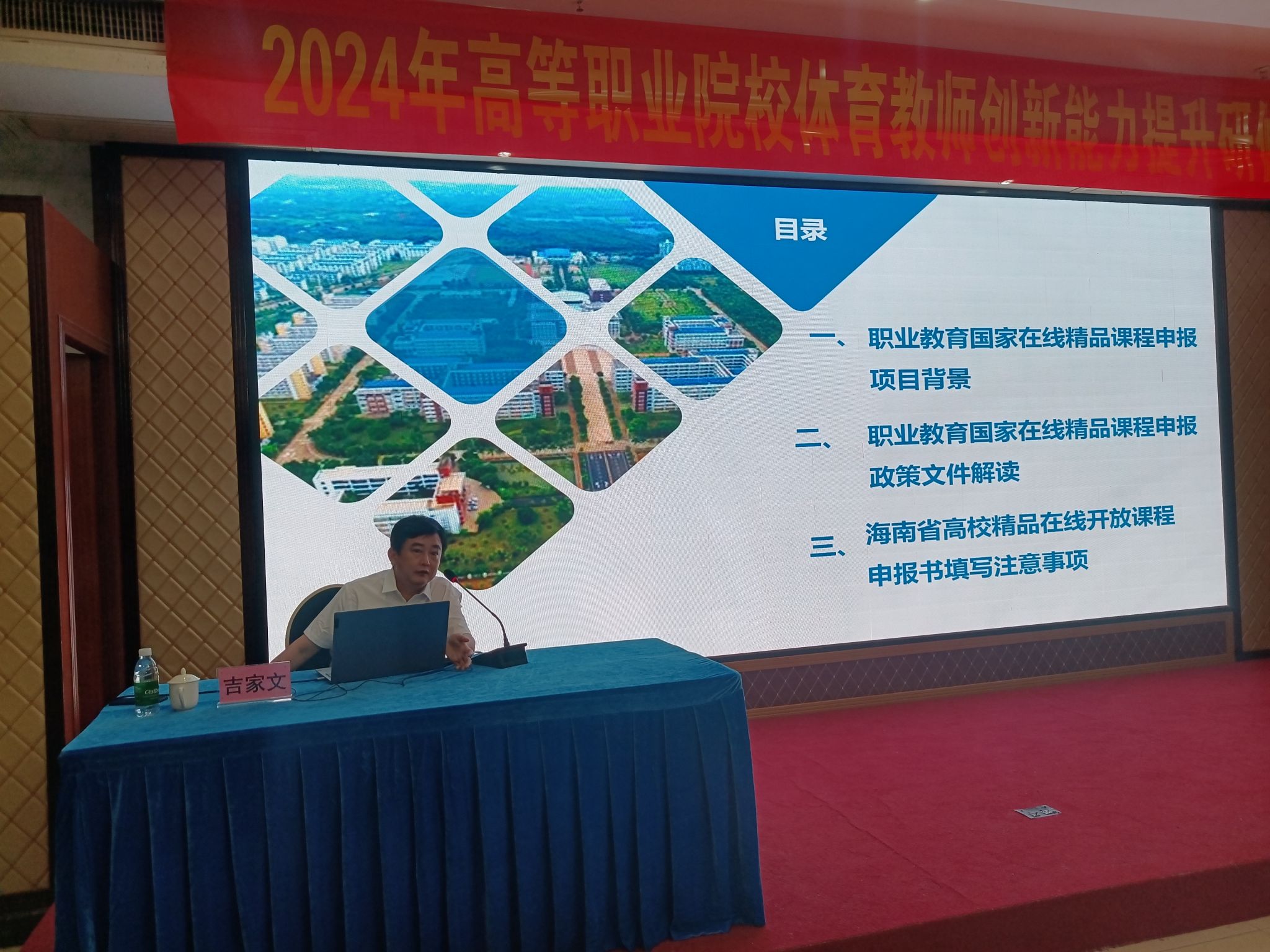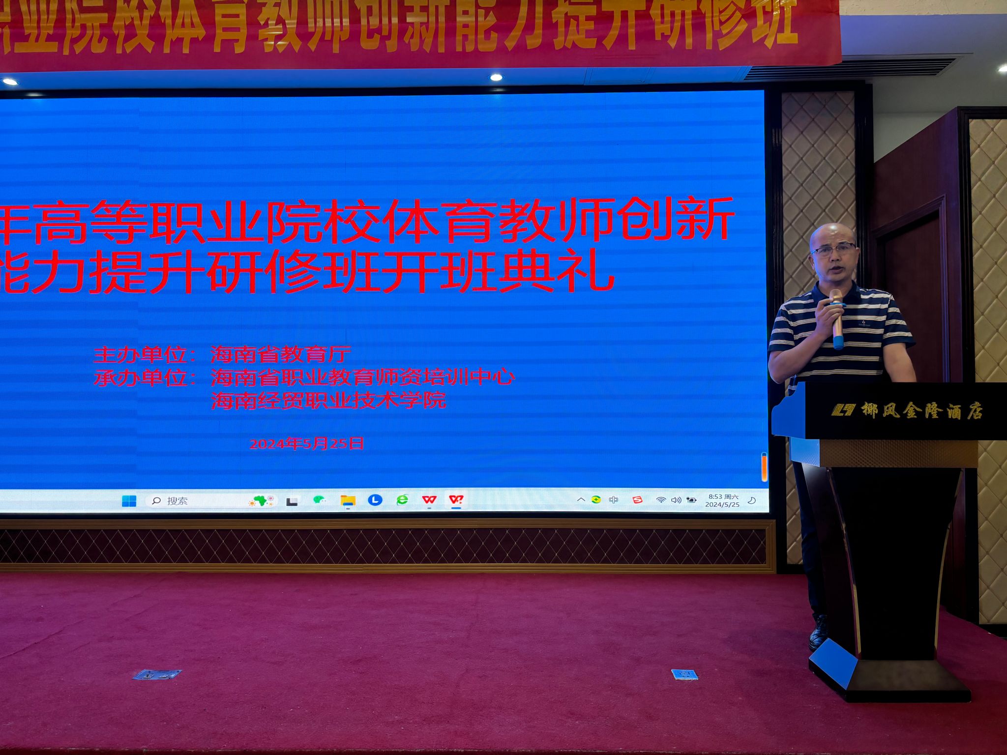 2024年5月25日至26日,由海南省教育厅主办,海南经贸职业技术学院、海南省职业教育师资培训中心承办的2024年全省高等职业院校体育教师创新能力提升研修班在琼海市举办,顺利完成全部培训计划,圆满结束。来自全省14所高职院校共80名体育教师参加本次培训,海南经贸职业技术学院太阳成集团tyc院长胡友波主持培训会,海南经贸职业技术学院太阳成集团tyc党总支书记曹迪伟出席培训会。