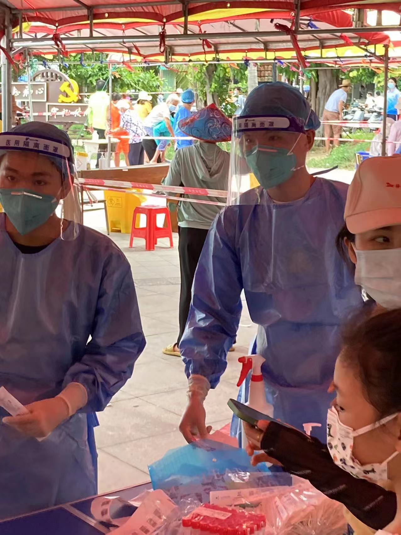 郑鼎同学作为众多抗疫志愿者中的一员,从加入抗疫队伍至今一直坚守着。“我第一次知道,原来长时间在高温下戴手套真的会磨出水泡。”郑鼎同学说,“大家都是如此,都很坚强、很坚韧。”跟郑鼎同学一起并肩奋战的还有几位女生,他们共同细致耐心地做好信息采集,维持现场秩序等工作,以实际行动构筑起抗击疫情的铜墙铁壁,共同谱写一首“抗疫之歌”。