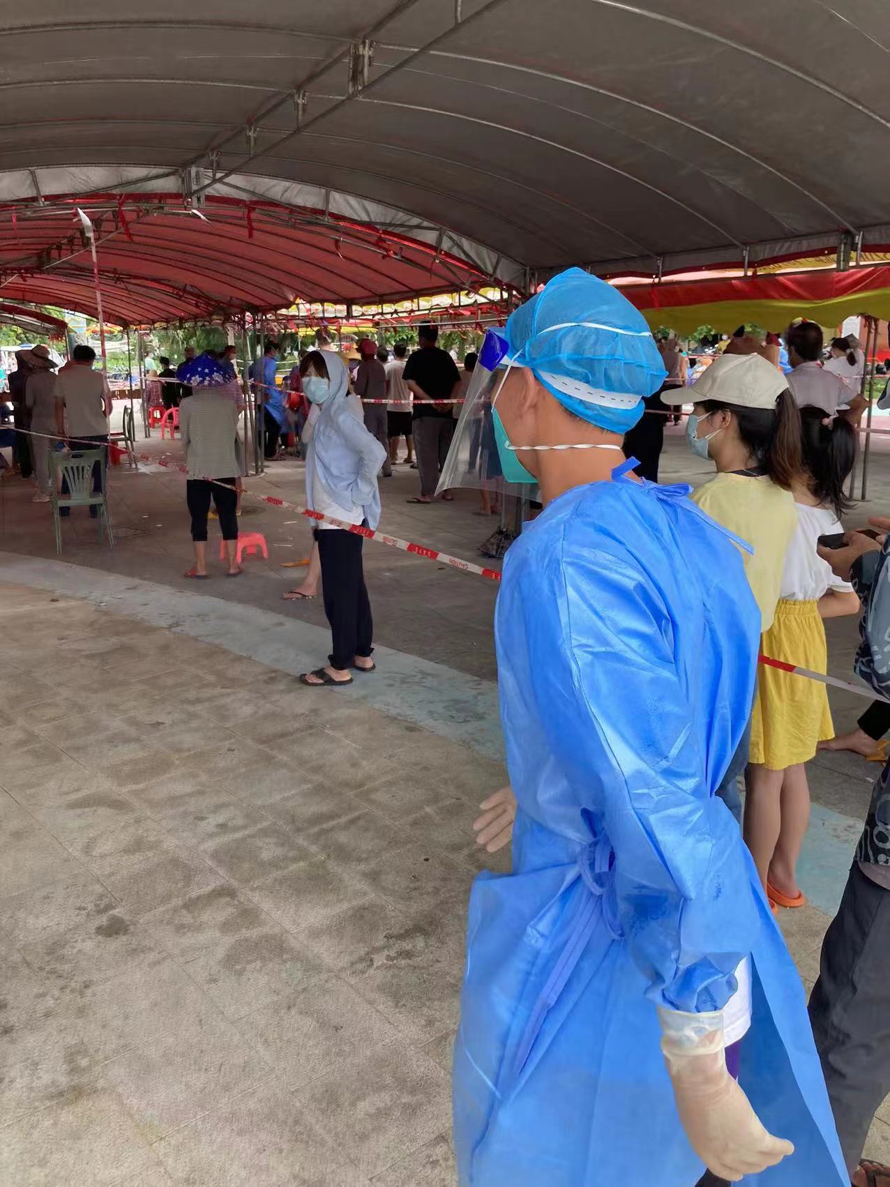顶着烈日,身穿防护服,体院学子郑鼎同学奋战在乐东县莺歌海镇抗疫第一线。郑鼎同学朝我们比了个胜利的手势后就开始了一天的抗疫志愿服务工作。在美丽的莺歌海小镇,活跃着一群最美志愿者的身影,他们守望相助、尽己所能,坚决当好疫情防控的“守门员”、“跑腿员”、“宣传员”,为打赢这场战“疫”贡献自己的力量。